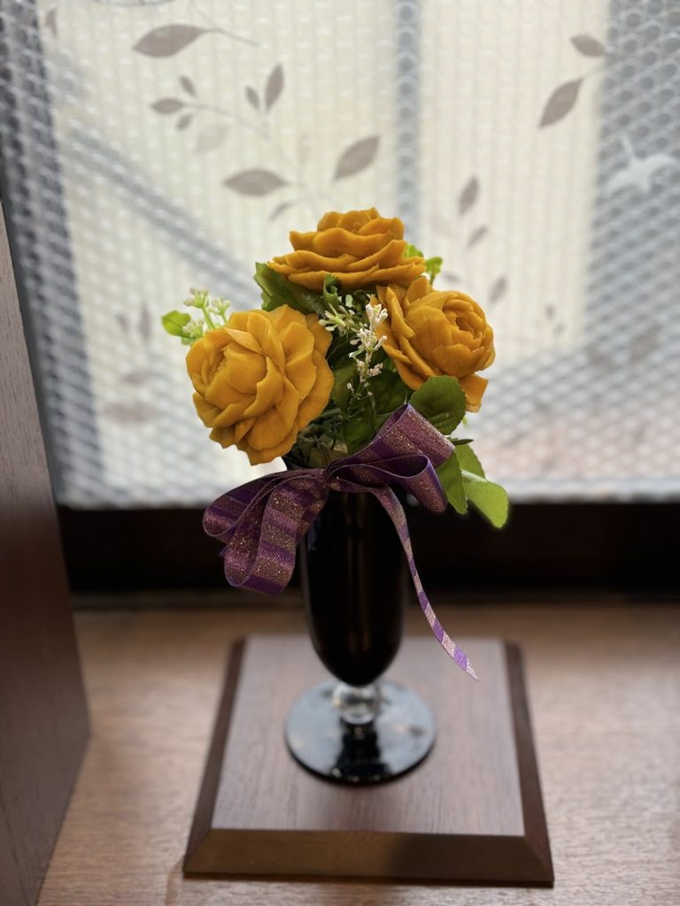 現在2人の先生に教わっております。ひとつのお教室では、初級コースと薔薇速習コースで認定資格を取得し、現在は中級と季節ごとの立体フラワーカービングなどを受講中。別のお教室では、日本カービング普及協会(JCPA)のソープカービング2級(中級クラス)取得クラスを受講中。